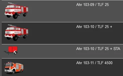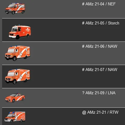 Fahrzugbenennung: Ortsname (abgekürtzt) / Wachennummer-Fahrzeugnummer / Fahrzeugtyp + Anhänger (wenn vorhanden).