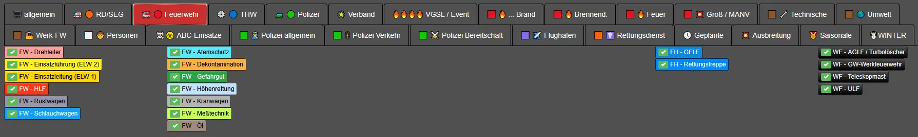 Für Einzelfahrzeuge, die beim Alarmieren mal wieder durch den Server verschluckt wurden, sowie für Kleineinsätze hab ich entsprechende Buttons. 1LF, 2LF, das gleiche für Polizei, THW und Rettungsdienst.