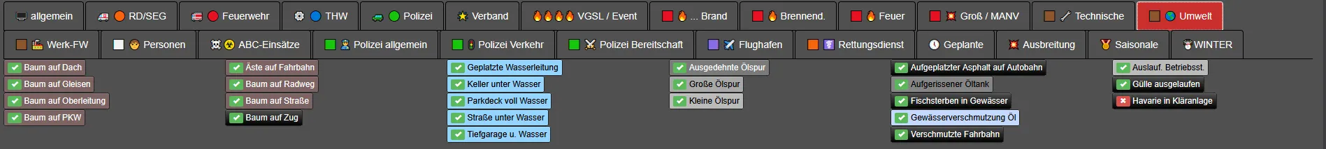 in meiner AAO inspiriert von Tute habe ich sämtliche einsätze hinterlegt katekoriert in verschiedene Kategorien, vom Brand über TH zu den Sonderwachen Flughafen und Werkfeuerwehr.