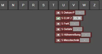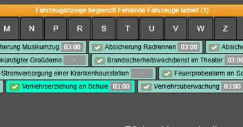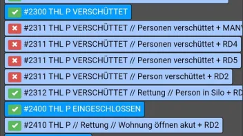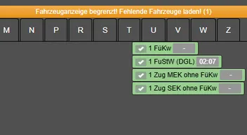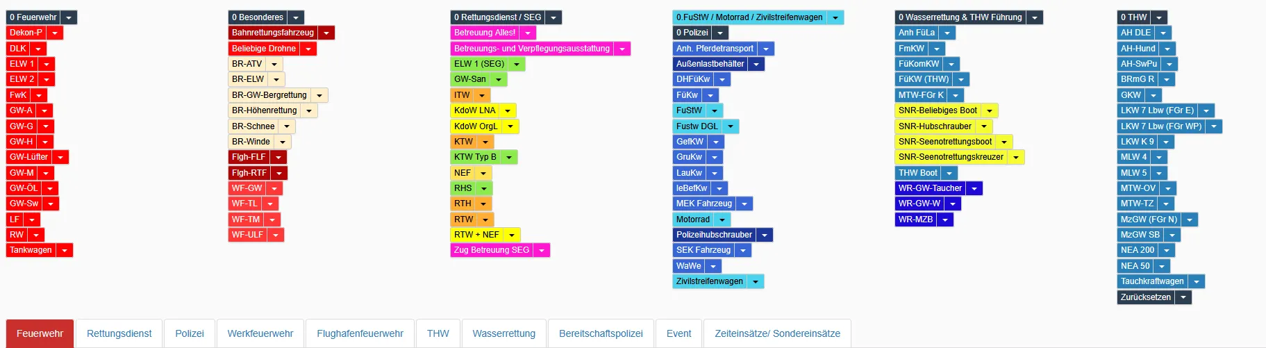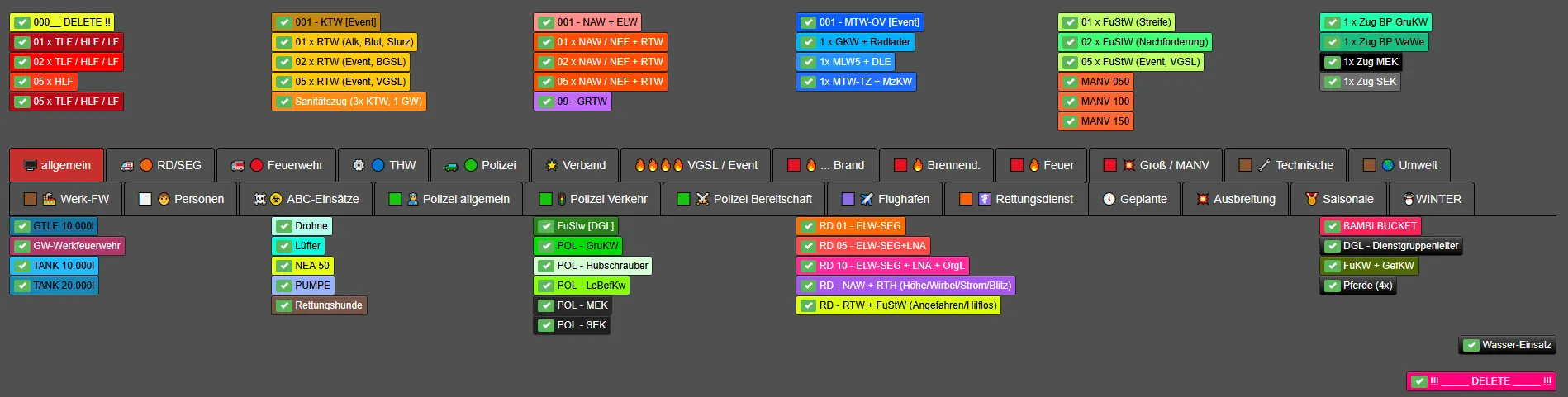 Dem Realbau geschuldet sind meine Anforderungen an ausrückende Fahrzeuge etwas komplex, deshalb verwende ich nur fest eingestellte Züge in den Bereichen SEG, Wasserrettung, BePo und THW. Der Rest muss manuell gewählt werden.