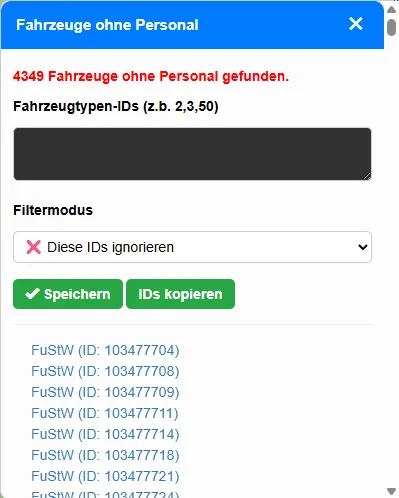 Ich habe mal ein Sript geschrieben das alle Fahrzeuge ohne Personal Zuweisung auflistet. Die Aufgelisteten Fahrzeuge können gleich im Personalzuweisungs Menü geöffnet werden. Es besteht zusätzlich die Funktion alle ID´s zu kopieren.