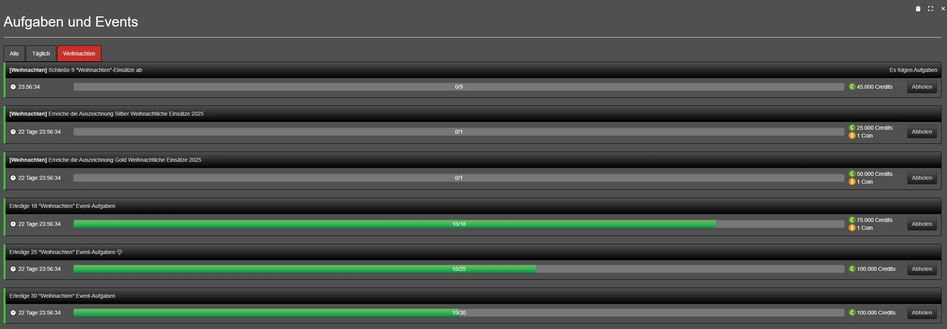 Hab mittlerweile auch schon über 30 "Weihnachtliche Einsätze" absolviert, in der Eventliste gezählt wurden davon bisher 10 Stück.