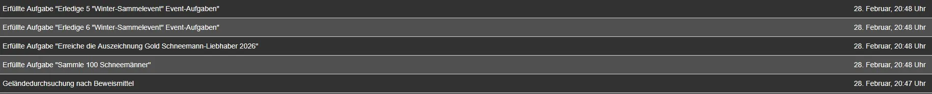 Aber ich bleibe bei meiner Meinung generell. Die Aufgabe ist schaffbar, auch wenn man nicht 24/7 generiert und alle Einsätze abschließt. Diese Spieler hatten die Schneemänner vermutlich am Späten Freitagabend bereits erledigt.