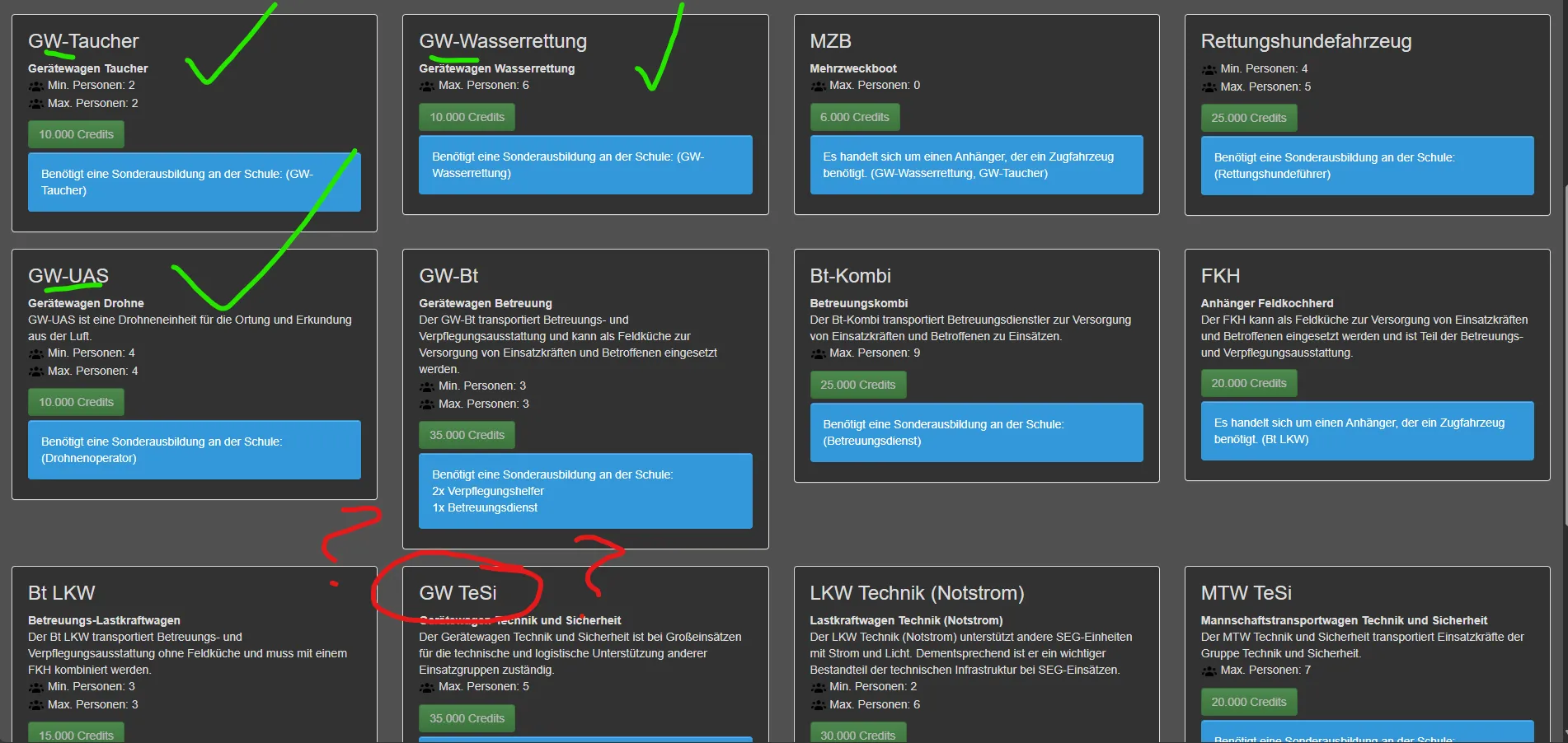 ZitatAlles anzeigenTatsächlich ist dem aktuell (und auch schon zu Sebastians Zeiten, nochmal gegengecheckt) nicht so, ein MTW zählt nicht beschleunigend auf den fire_value (und damit die Abarbeitungsschwindigkeit) eines Einsatzes. Dies tun nur die Fahrzeuge in den Kategorien "Löschfahrzeuge" und "Tanklöschfahrzeuge".