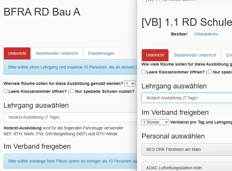 Also nein, die Skripte haben bei mir keinen Einfluss aufs Ergebnis. Testweise auch auf meinem Entwicklungsrechner mit Linux getestet (Chrome, Firefix), dort ebenfalls die gleiche Beanstandung.Ich kann gerade nur an eigenen Schulen eine Ausbildung erstellen, manchmal mit maximal 40 Personen, manchmal nur mit 10 Personen. Ein Pattern wodurch das ausgewählte Personal zurückgesetzt wird, kann ich nicht sehen. Die Console gibt mir auch keine Infos.