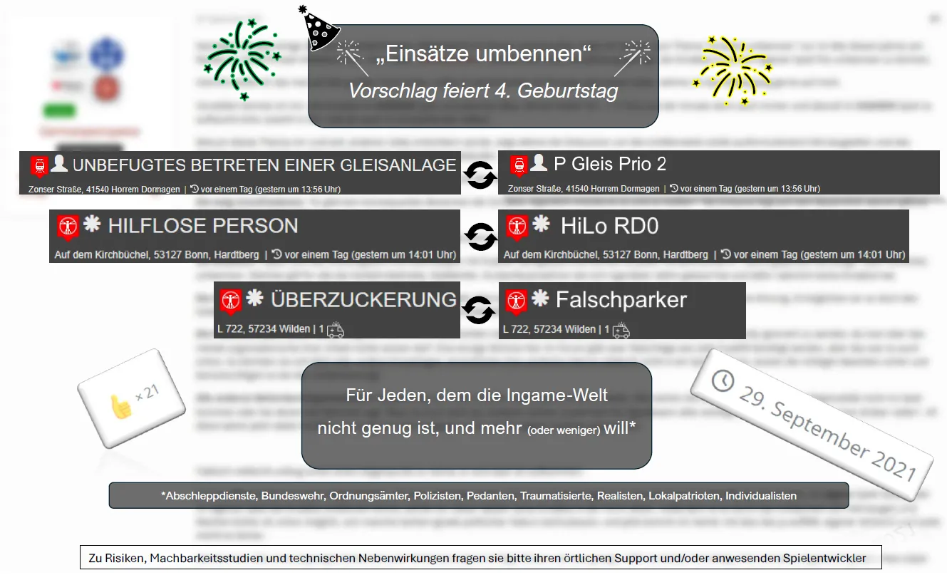 Vielleicht sollten wir uns einen komplett verrückten Einsatz leisten, aber nicht mit so einem seltsamen Titel (z.B. "Meilenstein ungefahren") und die Fahrzeuganforderungen müssten dann auch wirklich chaotisch sein. Sollte über die Einstellung der Eventeinsätze abstellbar sein und nicht nur einmalig auftreten, sondern allgemein halt sehr selten.